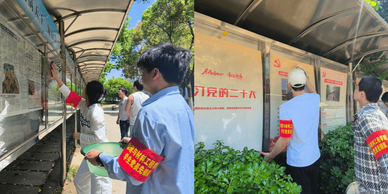 展板面前,党员师生认真擦洗玻璃和展板边角,打水、擦洗、换水、抹干,互帮互助,有条不紊,共同维护校园宣传阵地。