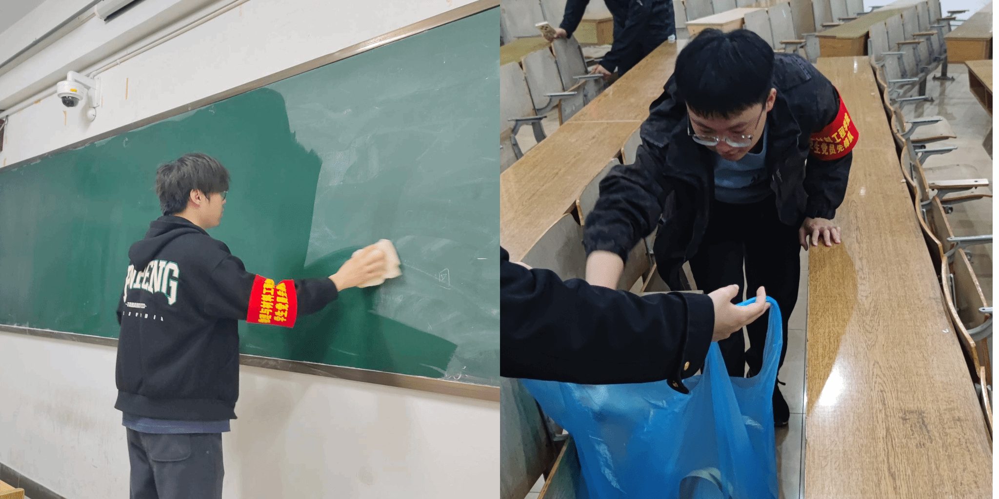 教学楼里,党员师生逐一打扫教室讲台,认真细致,将黑板擦净,并对垃圾进行集中清理。
