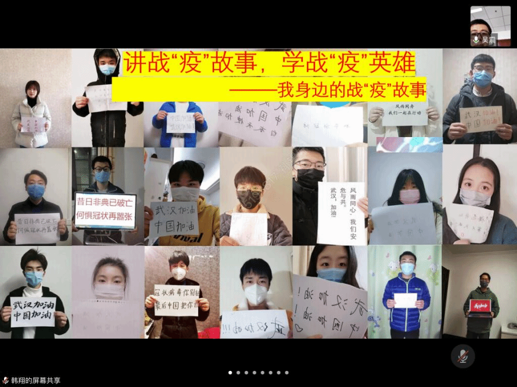 随后韩翔老师分享了物材公司2019级同学的战“疫”故事,李洲同学在除夕夜为疫情防控值班,让他有了不一样的新年,也有了不一样的收获和感悟。李哲同学在家乡成为一名志愿者,做好每一个细节,帮助居民减少风险。张紫荆同学在疫情期间作为志愿者学会与他人交流,学会关爱他人,并更深刻的领会到生命的意义。张沧同学在国家最需要的时候站出来为尽绵薄之力,感受到了基层的温暖。