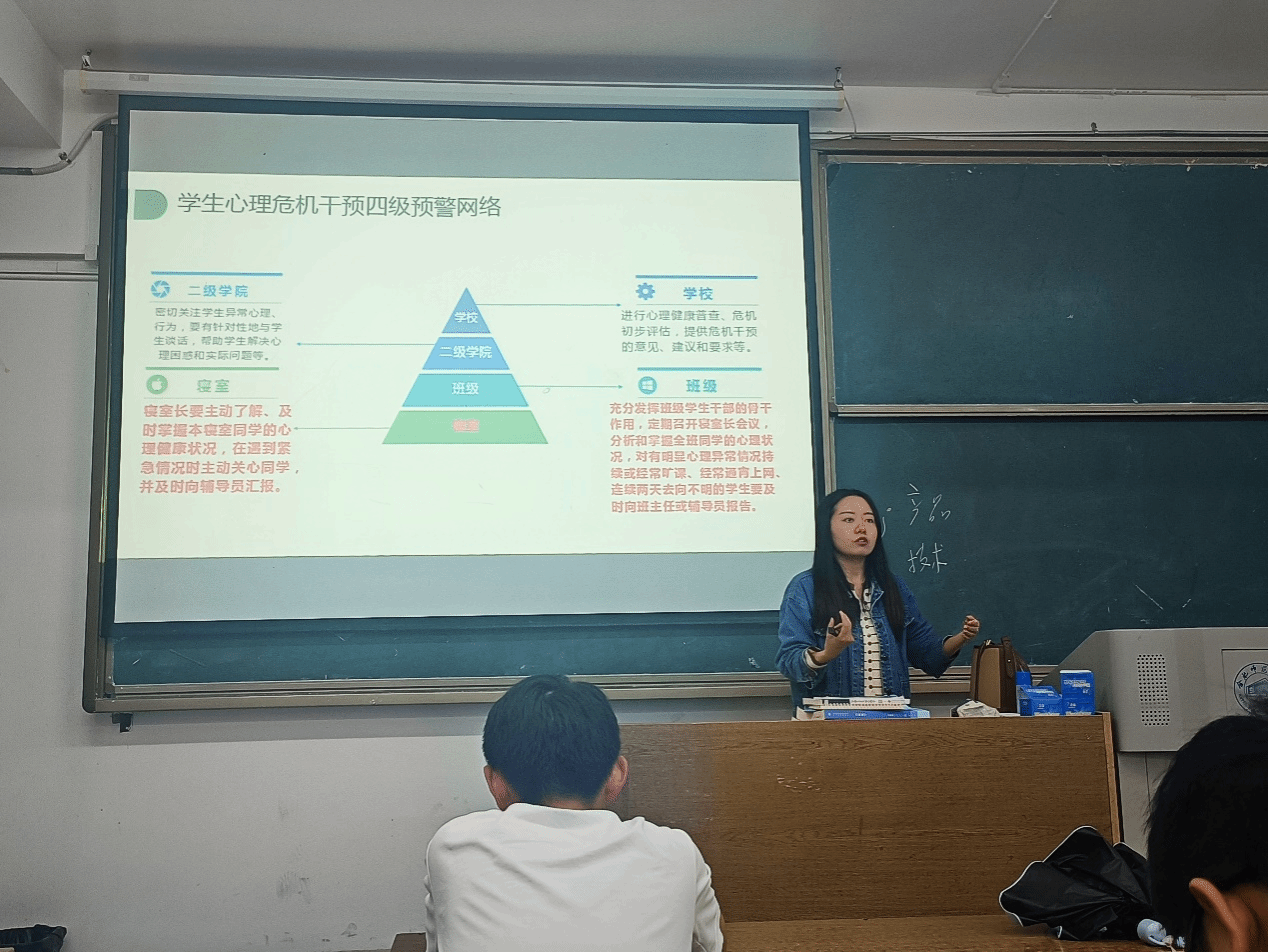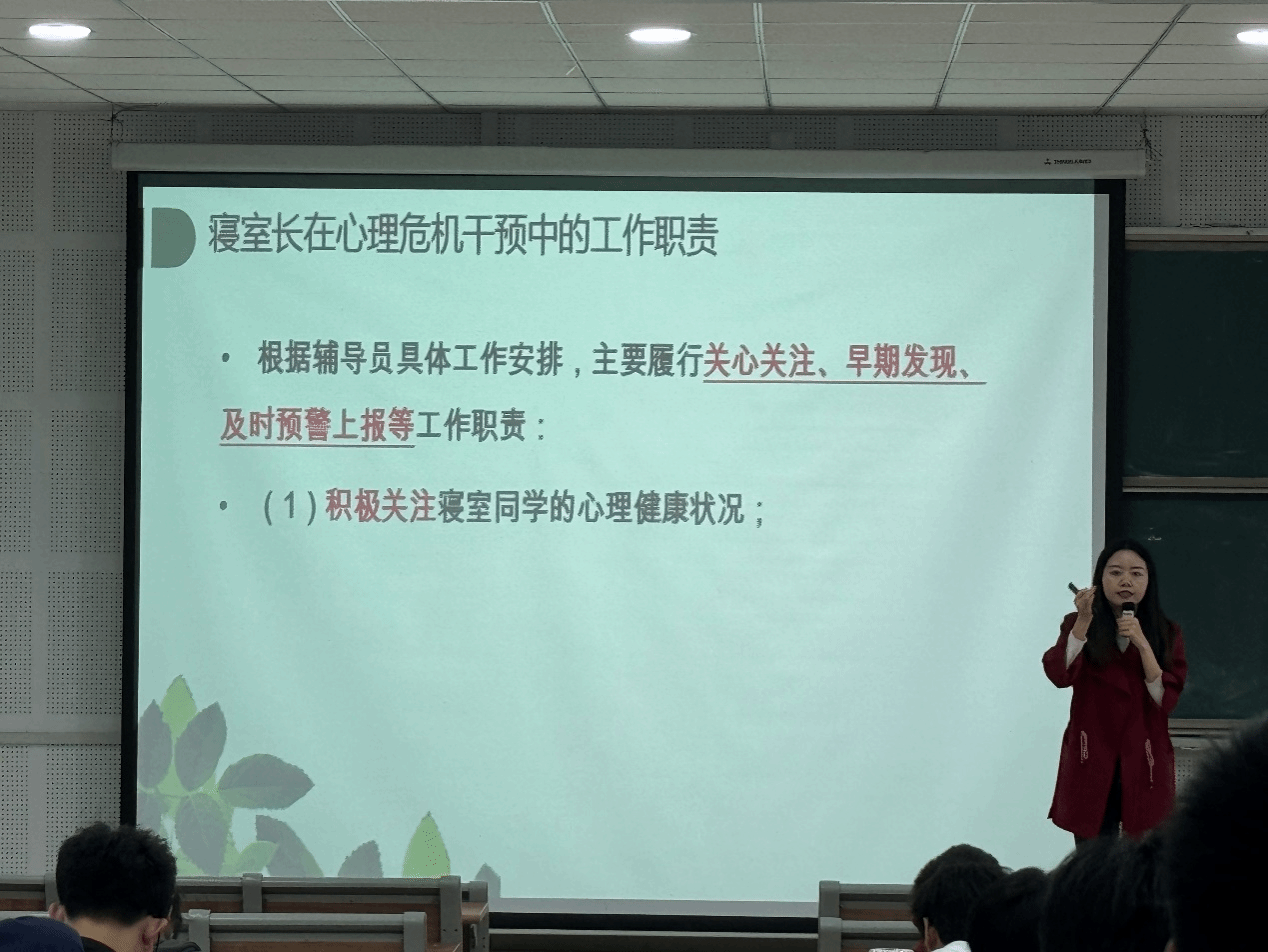 为进一步完善公司心理危机早期预警机制,发挥寝室长在“公司——院系——班级——宿会”四级预警网络中的重要作用,做到对员工心理危机干预“早发现、早报告、早干预”,4月24日-25日,太阳成集团122ccvip分别在锦绣、滨湖校区开展寝室长心理危机干预专题培训。辅导员、心理健康教育中心张玲俐老师进行授课,各年级全体寝室长、心理委员参加培训,培训会由辅导员韩翔主持。