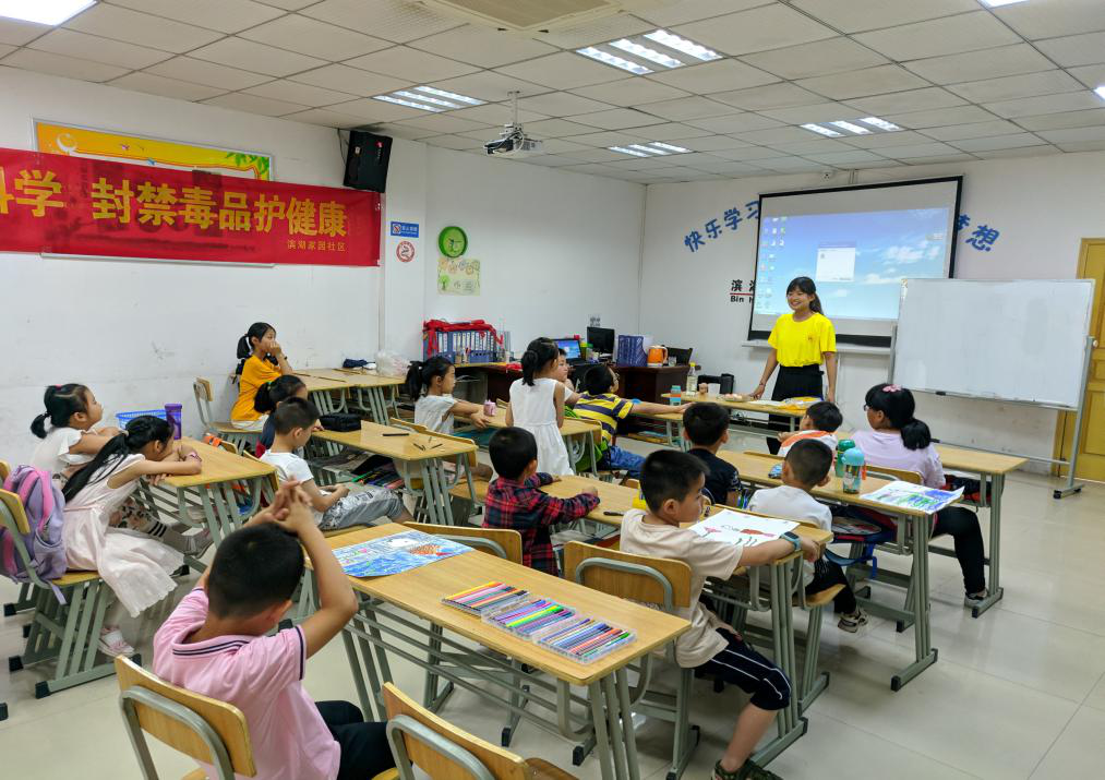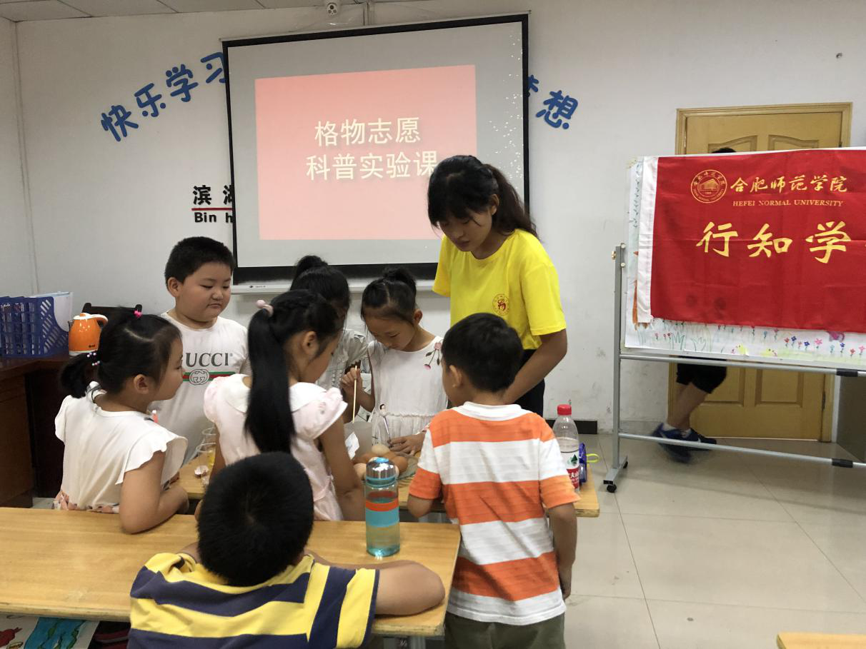 7月9号上午,科普志愿服务队与外国语公司“行知学堂”在合肥滨湖家园居委会进行了首次合作教学,来自太阳成集团122ccvip、外国语公司、艺术与传媒公司等9名小先生带着小学员们进行了一次趣味十足的科普实验课。