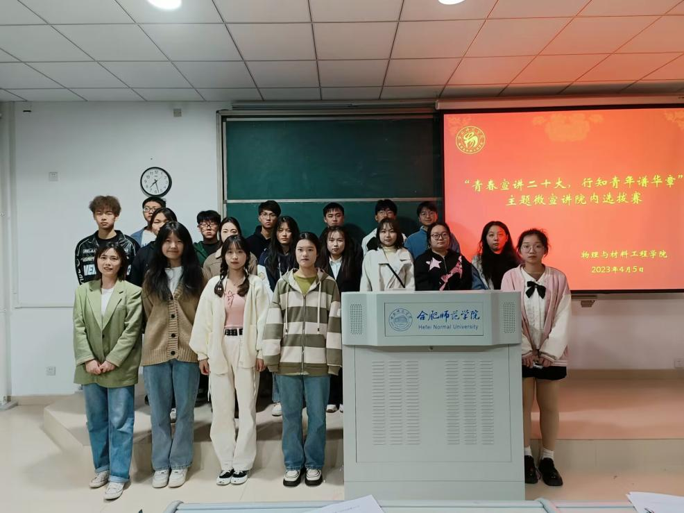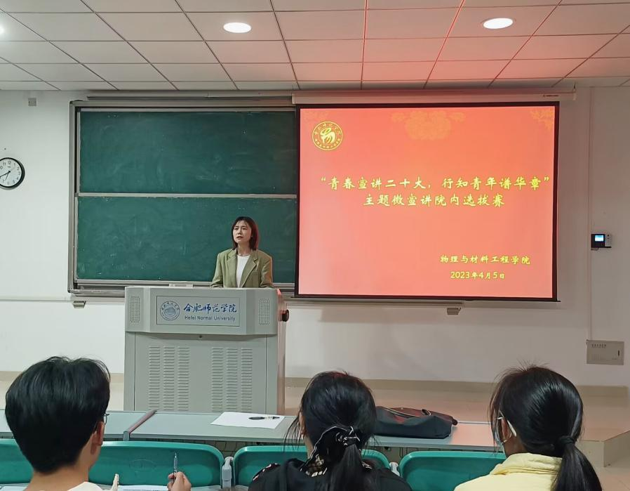 本网讯 为深入学习宣传贯彻党的二十大精神,进一步凝聚青年力量,4月5日晚,太阳成集团122ccvip在滨湖校区博学楼A205举办以“青春宣讲党的二十大,行知青年谱华章”为主题的微宣讲院内选拔赛。参赛选手为2022级各班思政委员,辅导员吴梦云和各班主要班委担任评委。