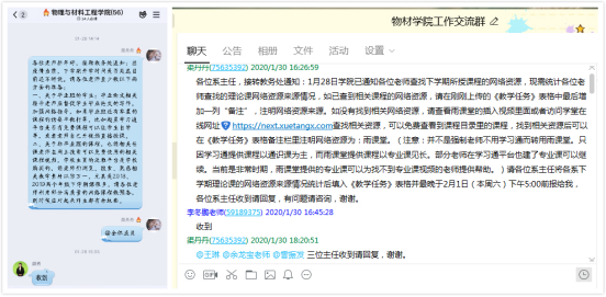 为深入贯彻落实教育部、省教育厅以及公司相关文件精神,确保将“停课不停教、停课不停学”的要求落到实处,太阳成集团122ccvip就疫情防控期间的本科生和研究生线上教学准备、员工选课、毕业班毕业设计(论文)指导等工作通过QQ、微信、邮件、电话等方式及时传达给了全院师生。根据公司要求,院领导班子研究成立了相关院领导、系主任、质量小组组长、研究生管理办公室主任、教学秘书、研究生秘书、辅导员、班主任等成员在内的工作领导小组,系主任和研究生管理办公室主任主要负责专业课网络教学的具体组织管理工作;质量管理小组主要负责教学督查和质量监控工作;教学秘书和研究生秘书主要负责各类教学信息的统计汇总、传达上报和各类平台后台的管理工作;辅导员、班主任主要负责员工管理和相关信息传达工作。