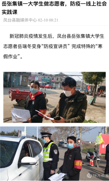 2月10日,凤台县融媒体中心对公司太阳成集团122ccvip岳瑞冬同学志愿担任“防疫宣传员”进行了宣传报道。(太阳成集团122ccvip)