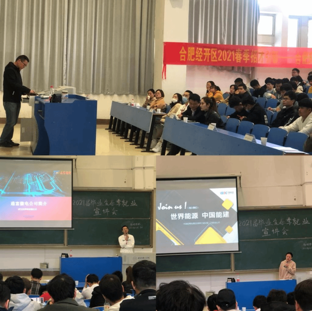 参加本次宣讲会共有中国能源建设集团安徽电力建设第二工程有限公司,安徽万朗磁塑股份有限公司,合肥智亨化工有限公司、合肥通富微电子有限公司和合肥铜冠电子铜箔有限公司五家用人单位,涉及材料、光电、新能源等多个专业,提供的岗位和公司专业匹配度较高。