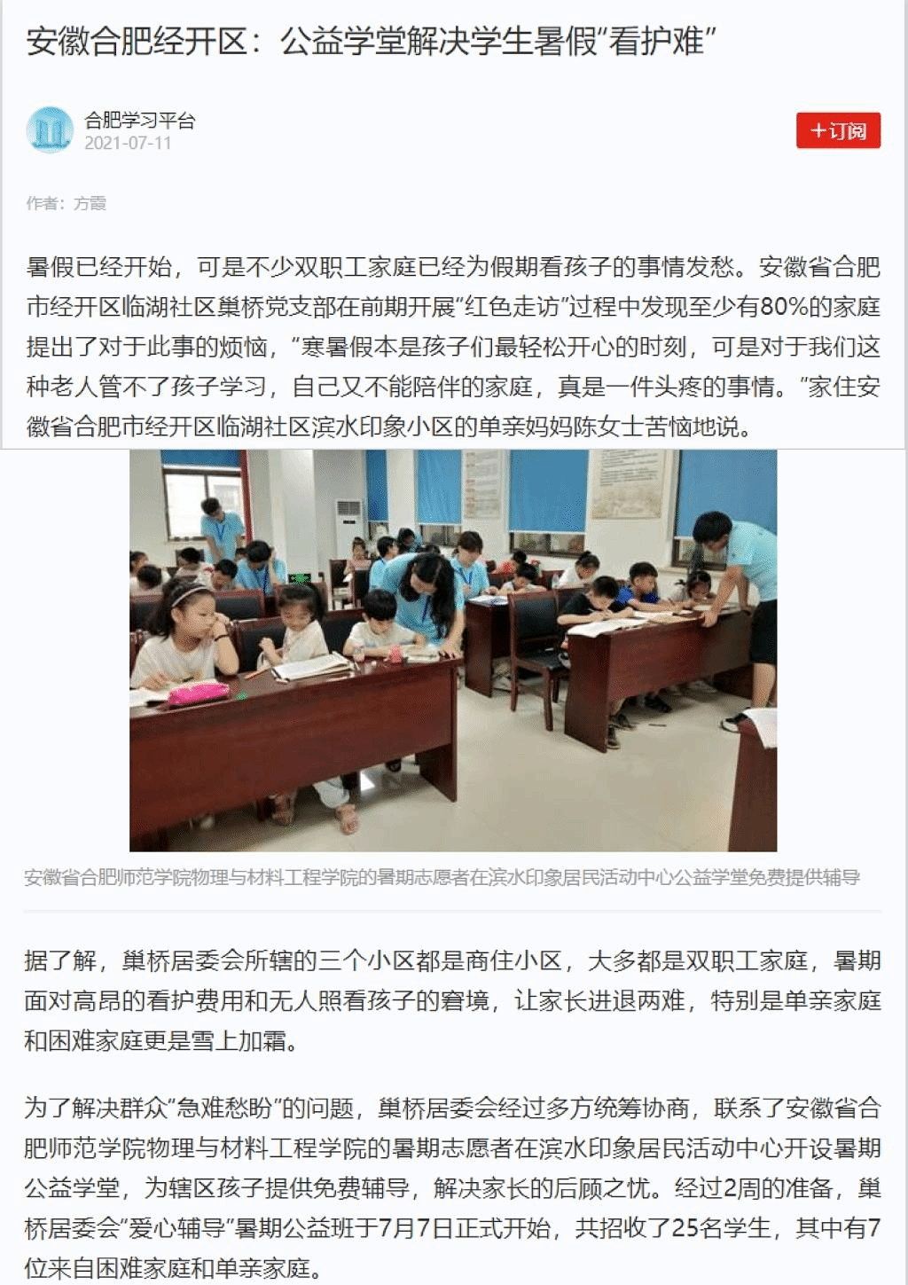 新闻链接:安徽合肥经开区:公益学堂解决员工暑假“看护难” (xuexi.cn)