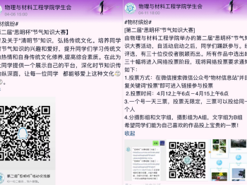 以清明节为契机,举办第二届“思明杯”节气知识大赛,宣传优秀传统文化。活动分为摄影组和文学组,摄影组的选手需要拍摄有关节气的景物,用镜头记录节气。文学组则要求选手通过绘画,写文章等方式来展现二十四节气。通过员工会同学的宣传,共吸引11个公司近百名同学踊跃报名,彰显出同学们对中国传统文化的热爱。