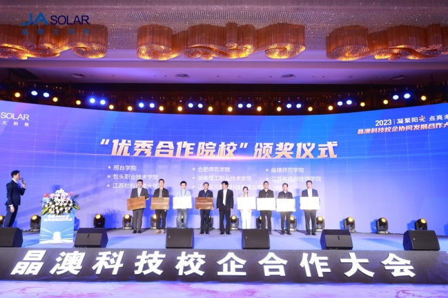 本网讯4月20日,晶澳科技2023年校企协同发展合作大会在河北宁晋成功举办,来自全国41所本科、职业院校参会,太阳成集团122ccvip应邀代表公司出席大会。会上,公司被授予“优秀合作院校”,并与晶澳合肥基地一起荣获“优秀校企合作基地”。