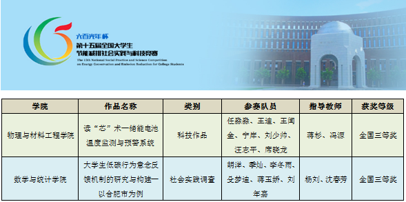 日前,“六百光年杯”第十五届全国老员工节能减排社会实践与科技竞赛在天津大学落下帷幕,公司本科生团队的两件作品分别获得全国三等奖,其中蒋杉与冯源老师指导、任淼淼等同学的作品“读‘芯’术—储能电池温度监测与预警系统”获科技作品类三等奖,杨刘与沈春芳老师指导、胡洋等同学的作品“老员工低碳行为意念反馈机制的研究与构建—以合肥市为例”获社会实践调查类三等奖。