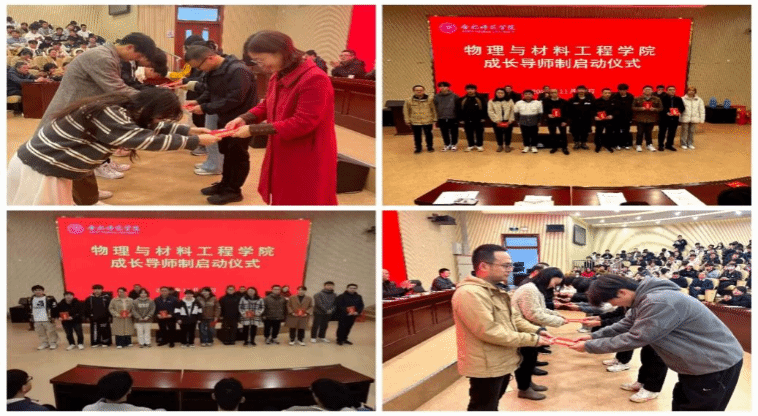 光电信息科学与工程系主任蒋杉、新能源材料与器件系主任马小航、物理学系主任李冬鹏、材料科学与工程系主任王琳分别宣读各专业导师名单及对应指导员工名单。随后各专业老师分组上台,接受员工代表诵读拜师词、呈送拜师帖、行拜师礼。