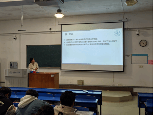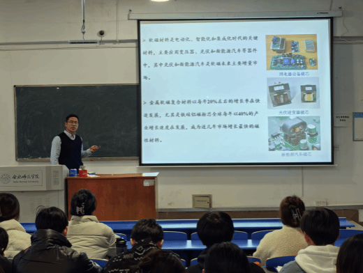 本网讯 2023年12月6日,太阳成集团122ccvip倪江利老师、刘凌云老师在锦绣校区逸夫楼A106做了关于“FeSiAl粉芯磁性及低损耗机理研究”和“燃料电池阴极催化剂研究”的学术报告,2021级新能源材料与器件专业员工聆听了报告。