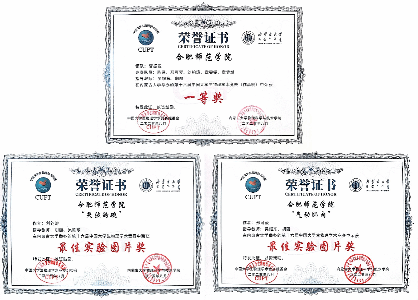 CUPT国赛作品赛一等奖和最佳实验图片奖证书