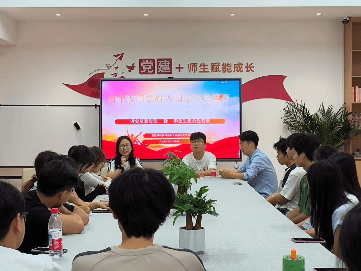 正值公司建校70周年校庆之际,新能源材料与器件专业员工党支部于10月9日在滨湖校区一站式社区组织开展"新老党员面对面"主题党日活动。党支部邀请已毕业员工党员代表陈晓艺、鲍振洋返校,与在校员工党员、入党积极分子代表举行交流座谈会,会议由党支部书记韩翔主持。