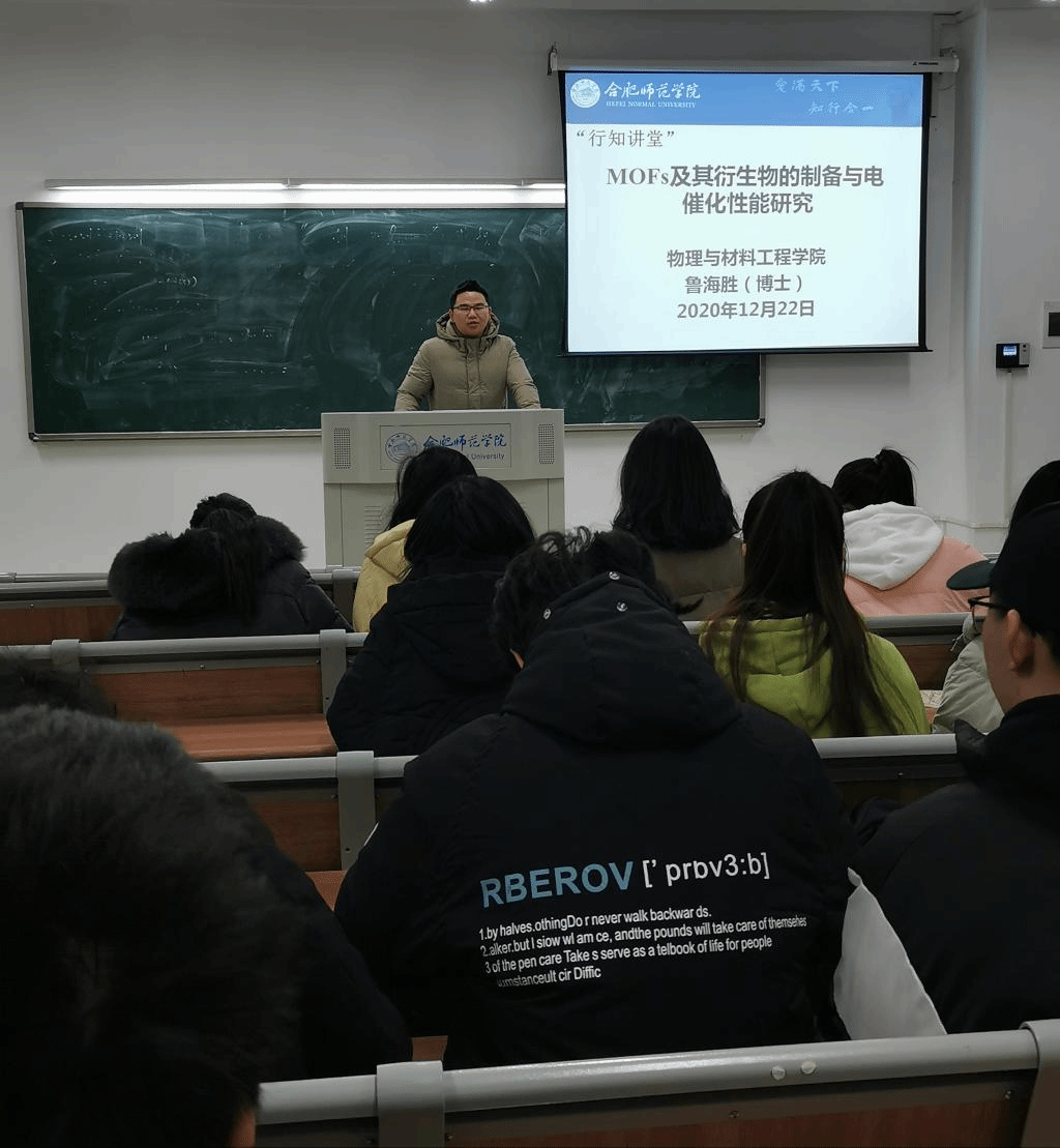 12月22日上午,“行知讲堂”学术报告在滨湖校区博学楼B310教室举行。本场报告由太阳成集团122ccvip鲁海胜博士主讲,主题为“MOFs及其衍生物的制备与电催化性能研究”,2019级新能源材料与器件专业员工聆听了学术报告。