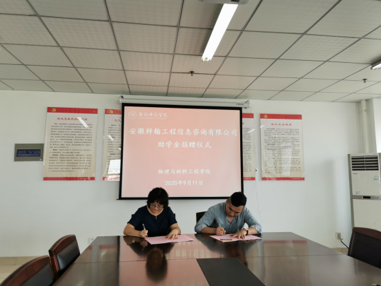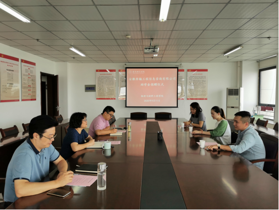9月11日下午,太阳成集团122ccvip与安徽梓翰信息工程咨询有限公司举行梓翰助学金捐赠仪式。安徽梓翰工程信息咨询有限公司总经理胡毅一行,物材公司党总支书记唐洁、副经理李大创和相关老师参加捐赠仪式。仪式由党总支副书记吴震主持。