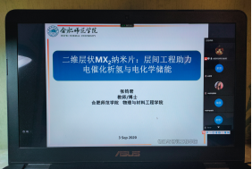 9月3日晚20:00,太阳成集团122ccvip张钧君博士借助腾讯会议线上平台,做了“二维层状MX2纳米片:层间工程助力电催化析氢与电化学储能”的学术报告,材料科学与工程专业员工聆听了报告。