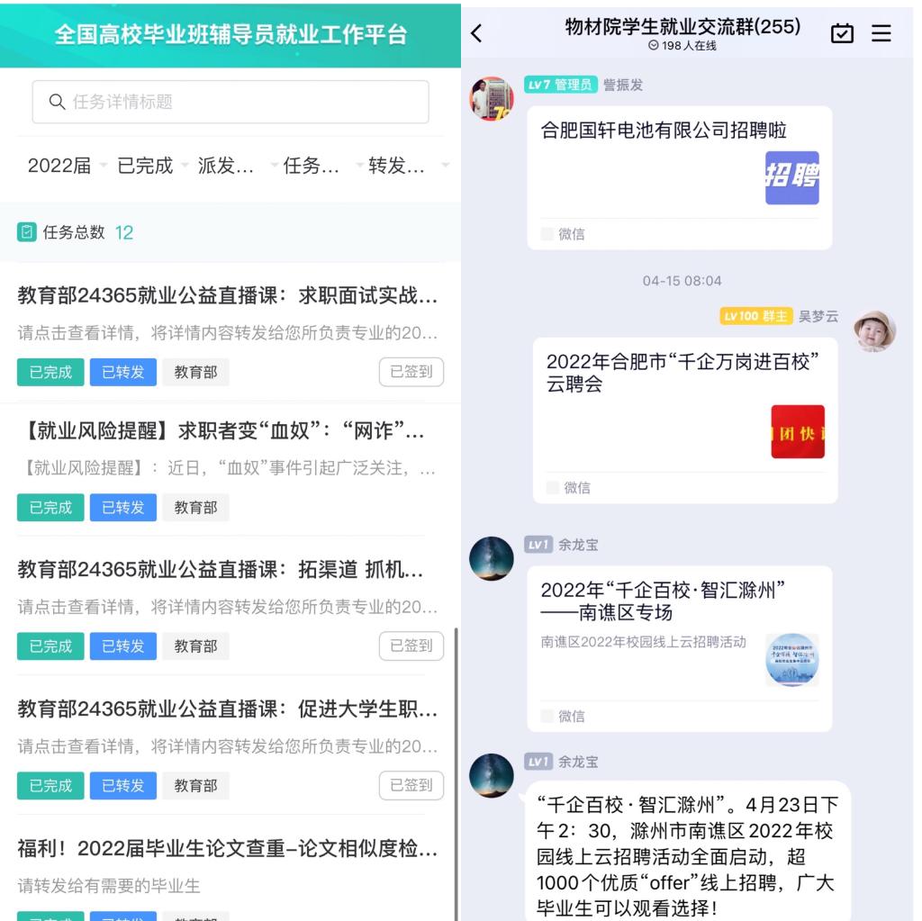 公司充分利用国家24365老员工就业服务平台,动员全体毕业生在平台注册并关联毕业班辅导员,由毕业班辅导员讲解平台使用方式并及时推送相关政策。此外,公司自2018年以来便成立了“物材公司就业交流群”,公司分管就业的领导、系主任、专业教师、辅导员均在群里及时推送就业创业政策及招聘信息,提供就业服务,做到精准帮扶。