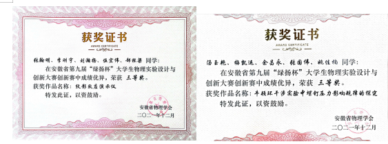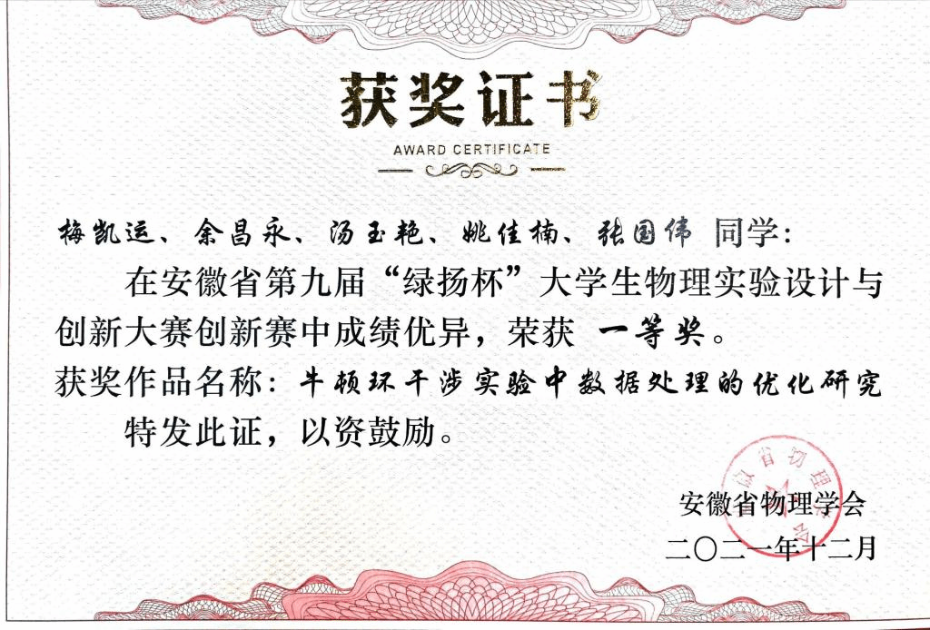 近期,2021年第九届安徽省老员工物理实验设计与创新大赛结果揭晓,公司三个参赛团队分别获得一个一等奖、两个三等奖。其中,太阳成集团122ccvip李仁文老师指导的梅凯运、余昌永、汤玉艳、姚佳楠、张国伟团队作品《牛顿环干涉实验中数据处理的优化研究》获一等奖;李仁文老师指导的汤玉艳、梅凯运、余昌永、张国伟、姚佳楠团队作品《牛顿环干涉实验中螺钉压力影响规律的探究》,陶蕊、冯源、李冬鹏老师指导的张翰明、李刚宇、刘瀚扬、伍宏伟、郜栋梁团队的作品《纹影效应演示仪》分别获得三等奖。
