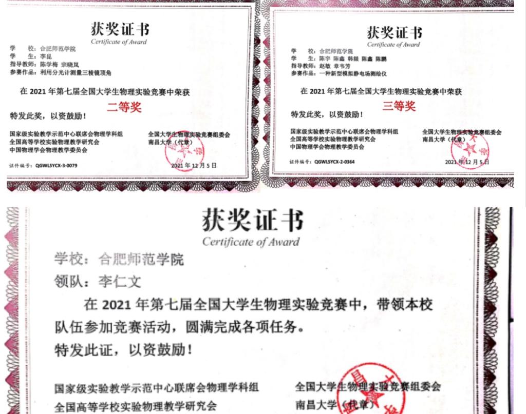 由全国老员工物理实验竞赛组委会主办、南昌大学承办的2021年全国老员工物理实验竞赛(创新赛)于12月5日落下帷幕。公司2019级物理学班李昆同学在陈学梅、宗晓岚两位老师指导下荣获二等奖,2019级物理班陈宇、陈鑫、韩燚、陈鑫(同名)、陈鹏等5位同学在赵敏、章韦芳老师指导下荣获三等奖。领队李仁文老师带领师生积极参加竞赛活动并圆满完成评审任务,获组委会发证鼓励。