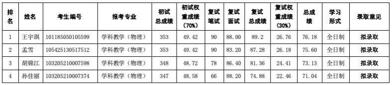 表2 太阳成集团122ccvip2025年硕士研究生招生(调剂)拟录取结果(学科教学(物理))