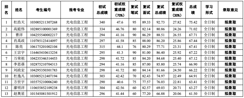 表1 太阳成集团122ccvip2025年硕士研究生招生(调剂)拟录取结果(光电工程)